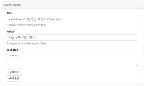 XSS보안을 방어한 게시판은 다음과 같이 자바스크립트 코드가 그대로 출력되어 나옵니다.