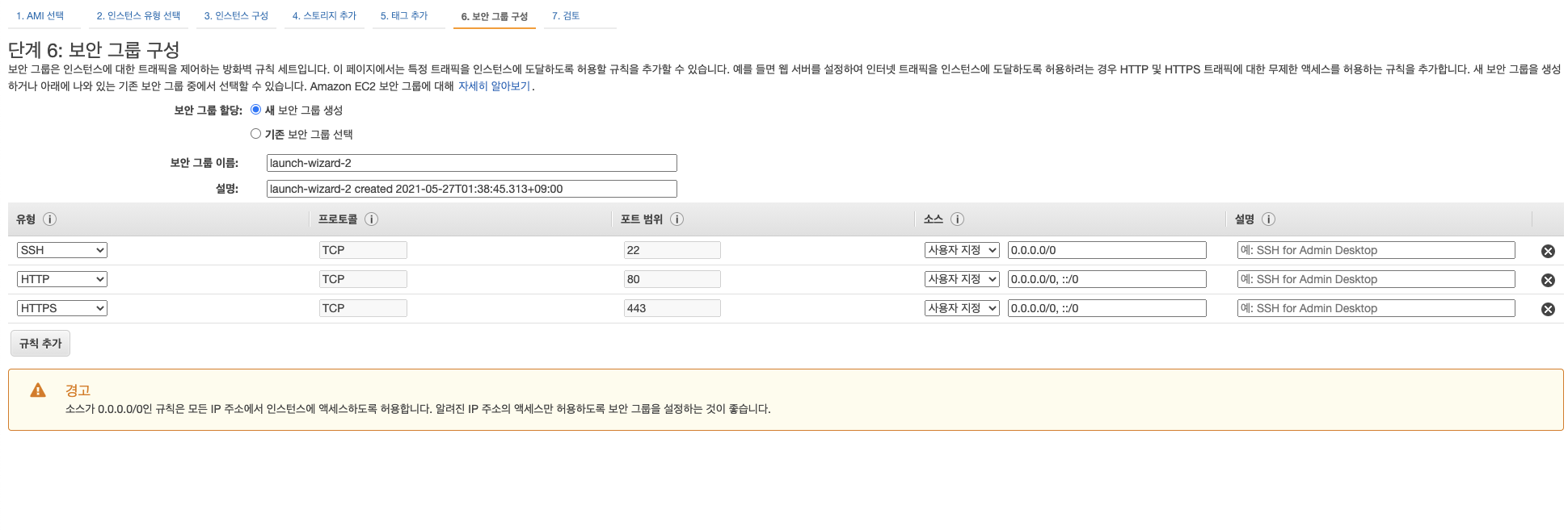해당 단계에서는 기본으로 SSH만 등록되어 있는데 추가로 HTTP & HTTPS 를 등록해주자 여기서 보면 각각의 포트 범위를 알 수 있는데 나중에 이와 관련하여 설명할 것이다!