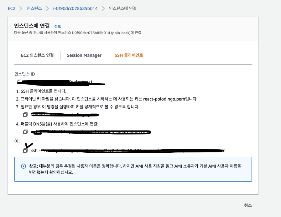 그 후 aws의 ec2 -> 해당 프로젝트 -> 연결 버튼을 누르면 SSH 클라이언트 쪽에서 ssh로 시작되는 주소를 복사해서