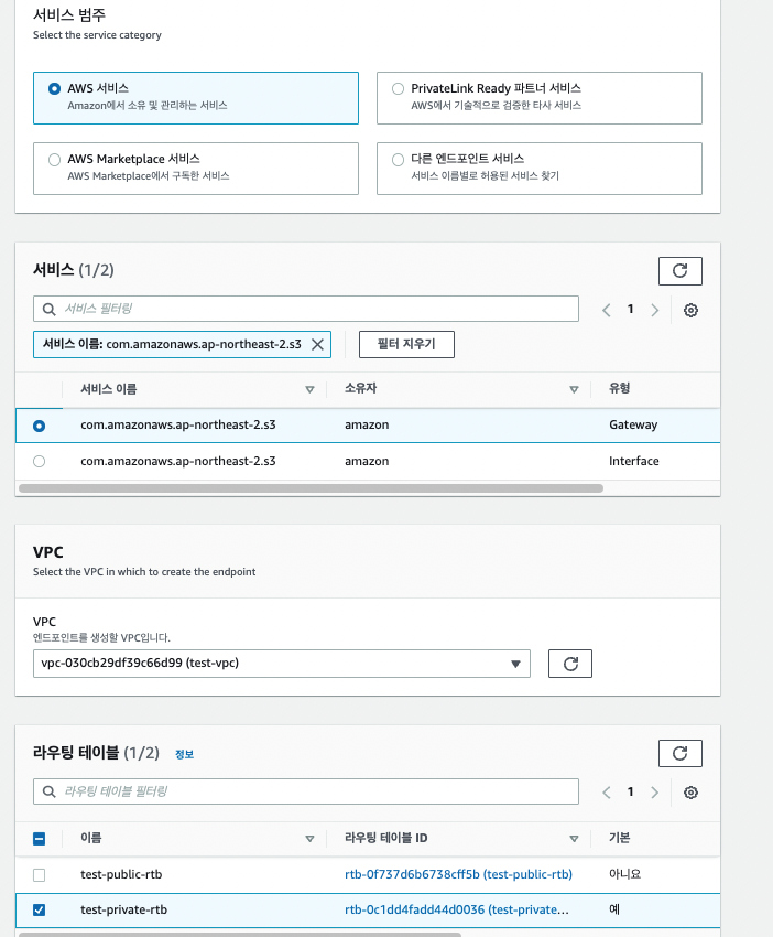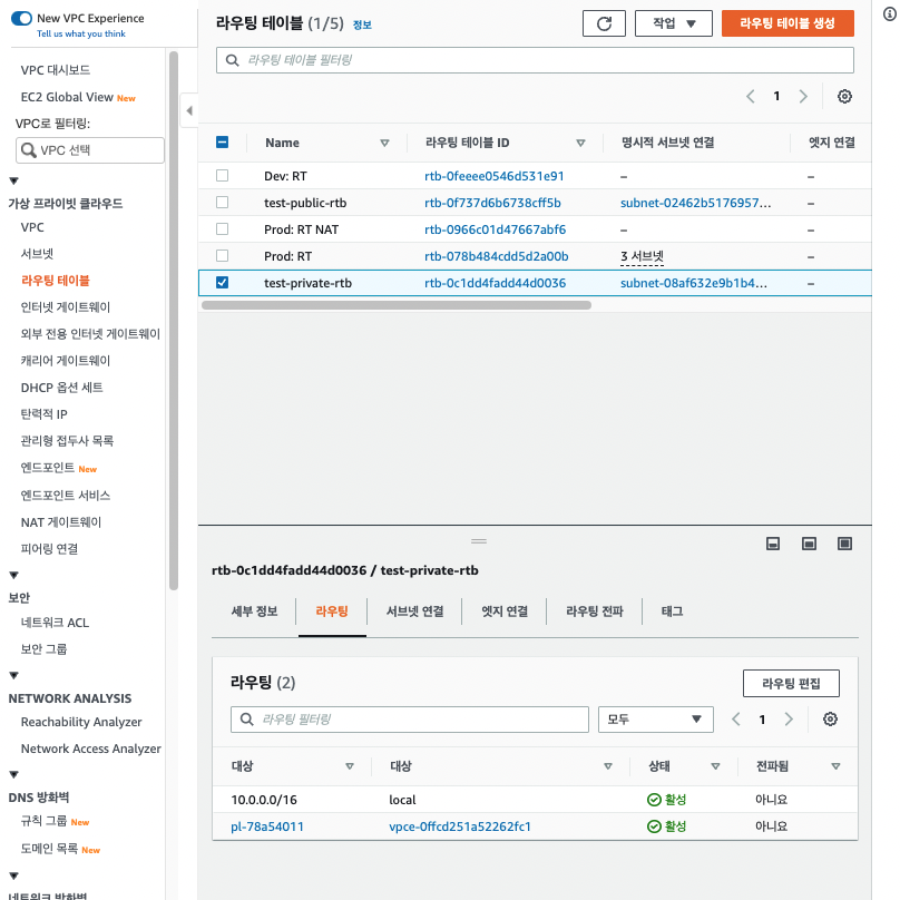 그럼 다음과 같이 endpoint의 라우팅 테이블에서 프라이빗 서브넷이 설정된 것을 볼 수 있는데요.