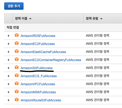 먼저 S3에 접근하기 위해서는 IAM에 들어가서 권한을 부여해야 합니다.