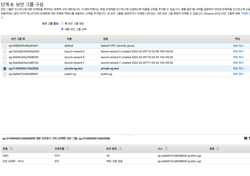 보안그룹에서 private 보안 그룹을 선택해보면 소스에서 public-sg로 선택되어 있는 것을 볼 수 있습니다.