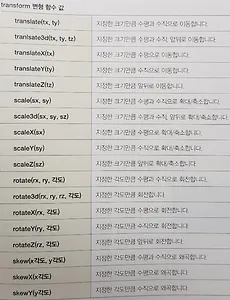 HTML&CSS45 <HTML5+CSS3> 애니메이션 속성 애니메이션 속성 트랜지션 속성: 한 스타일에서 다른 스타일로 바뀔 때 진행 시간을 지정해 변화.애니메이션속성: 트랜지션보다 애니메이션을 더 쉽게 만들 수 있다.animation속성과 transition 속성-이 속성은 트랜지션속성과 비슷한 점이 많다. 시작 스타일과 끝나는 스타일을 지정하면 CSS에서 중간 스타일을 자동으로 추가해 전체적으로 부드럽게 변화하는 애니메이션 효과를 만들어 낸다. %애니메이션과 트랜지션의 공통점과 차이점 공통점 : 애니메이션에 소요되는 시간이나 지연시간 등 지정차이점 : 애니메이션의 시작에서부터 끝날 EO까지 어느 지점이는 @keyframe속성을 사용해 애니메이션 정의 가능 animation-duration속성 – 애니메이션 실행 시간-이 속성은 애니메이션을 얼마 동안 재생할 .. 2018. 10. 22. <HTML5+CSS3>시간에 따른 변화를 만들어 주는 트랜지션 트랜지션이란 한 스타일에서 다른 스타일로 바뀌는 것을 말합니다. 트랜지션 속성은 브라우저 접두사를 붙여 사용해야 합니다 "transition-property 속성 – 적용할 트랜지션 지정하기" -트랜지션 효과를 만드는 첫 번째 단계는 CSS 속성 중 어떤 속성에 트랜시션을 적용할 것인지 선택 하는 것입니다. 그 결정을 이 속성이 합니다. 속성 값(1) none : 트랜지션 동안 아무 속성도 바뀌지 않습니다.(2) all : all값을 사용하거나 transition-property를 생략할 경우 요소의 모든 속성이 트랜지션 대상이 됩니다. 기본 값입니다.(3)속성이름: 트랜지션 효과를 적용할 속성 이름을 지정합니다. ex) 배경색만 바꿀것인지 width값을 바꿀것인지 원하는 것을 골라 지정 가능 쉼표로 구.. 2018. 10. 22. <HTML5+CSS3>변형과 관련된 속성들 transform-origin속성 –변형 원점 설정하기-이 속성은 지정한 요소의 변형 원점을 설정하는 것이다. transform속성과 함께 사용한다. 속성 값(1) x축:원점에서 x 좌표값으로, 길이 값이나 백분율 left,center,right중에서 사용가능 (2) y축:원점에서 y 좌표값으로, 길이 값이나 백분율 top,center,bottom중에서 사용가능(3) z축:원점에서의 z좌표값으로, 길이 값만 사용 가능 예를 들어 왼쪽 윗 부분을 기준으로 회전이나 왜곡 같은 변형을 실행하려면 다음처럼 지정한다.ex)trnasform-origin:left top; ->트랜스폼의 기준을 왼족 윗부분으로 perspective-원근감 표현하기-원래 있던 위치에서 사용자가 있는 방향이나 혹은 반대 방향으로 잡아당기.. 2018. 10. 22. <HTML5+CSS3>변형 2차원 3차원 좌표계-변형이랑 웹 요소의 위치를 옮기거나 크기를 조절하고 회전,왜곡 시키는 것을 변형이라고 한다. 단순히 수평이나 수직으로 이동하고 회전하는 것뿐만 아니라, 원근감을 추가한 3차원 변형도 가능하다.2차원 좌표: x축과 y축 이동 가능3차원 좌표:원근감을 더한 것 (z 축에서 앞뒤로 이동하는 것) transform속성 – 웹 요소 변형하기--예를 들어 수평으로 50px 수직으로 100px 이동시키려면 translate라는 변형 항수를 사용합니다ex)transfrom:translate(50px, 100px) -> x축으로 50 px, y축으로 100px 이동이 속성은 여러 가지 변형 함수를 사용할 수 있다 2차원 변형이나 3차원 변형 모두 가능하다. transform 변형 함수 값 trans.. 2018. 10. 22. <HTML5+CSS3>표 관련 스타일 table-layout속성-콘텐츠에 맞게 셀 너비 지정하기-표의 각 셀들은 태그나 태그를 사용해 구성된다. 하지만 이 태그에서 width속성을 이용해 셀 너비를 고정했을 때 여백없이 입력하면 셀 너비를 무시고 한 줄로 길게 입력되어 처음에 의도했던 표 레이아웃을 무너뜨린다. (545 page) 이 속성을 이용하면 셀 안의 내용의 양에 따라 셀 너비를 변하게 할지 고정시킬지 여부를 결정할 수 있다. 속성 값(1)fixed : 셀 너비를 고정합니다. 즉 셀 안의 내용 양에 따라 셀의 너비가 달라지지 않는다.(2)auto : 셀 안의 내용에 따라 셀의 너비가 달라진다. 기본 값(3)inherit : 부모 요소의 table-layout 값을 상속합니다. 다음 예는 셀 안의 내용에 따라서 셀 너비가 바뀌지 않도록.. 2018. 10. 20. <HTML5+CSS3>다단으로 편집하기 columm-width-단의 너비 지정하기-한 화면을 여러 개의 단으로 구성할 때, 단의 너비를 고정해 놓고 화면을 분할할 수 있다. 너비 값을 바꿀 수 없기 때문에 화면이 커지면 단의 개수가 많아진다.속성 값(1) 값 :단 너비를 직접 지정합니다.(2) auto : 단의 개수 colum-count같은 다른 속성을 이용해 단의 너비를 결정합니다. ex) div { column-width:80 px -> 각단의 너비 80px } column-count속성 – 단의 개수 지정하기-다단 화면을 만들 때 단의 개수를 먼저 정해놓고 화면을 분할할 수도 있다.속성 값(1) 개수 :0보다 큰 값으로 콘텐츠가 들어갈 단의 개수를 지정(2) auto : 단의 너비 column-width 같은 다른 속성으로 단의 개수를 .. 2018. 10. 19. 이전 1 2 3 4 5 ··· 8 다음