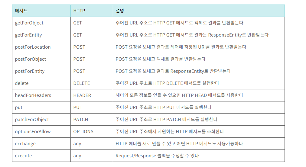 RestTemplate class는 Rest Service를 호출 하도록 설계되어 HTTP 프로토콜의 메서드
